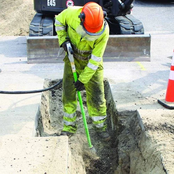 - AirSpade’s high-performance, patented supersonic nozzle generates a laser-like jet that moves at twice the speed of sound for faster, more effective digging. With non-sparking Nickle Aluminum Bronze nozzle, Brass components, electrically insulated 4 Ft. barrel rated to 300kV, and a lightweight, ergonomic handle, the Utility AirSpade 4000 maximizes jobsite safety while minimizing operator fatigue. Aluminum handle features full size grip opening to accommodate linesman’s gloves. Dead-man trigger ensures safe operation and trigger guard prevents accidental activation. Retractable stabilizer bar provides superior operator control. Integral pressure gauge ensures optimal digging performance