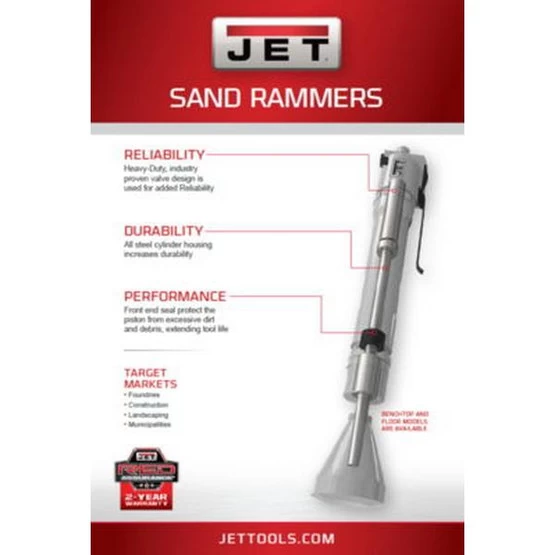 JET Sand Rammers are available in bench and floor models. The bench models deliver fast, powerful blows for ramming small, medium and large forms. The floor models deliver maximum power with slow, powerful blows that efficiently and quickly compact all types of backfill. Each model is ergonomically designed providing greater ease of handling with reduced operator fatigue